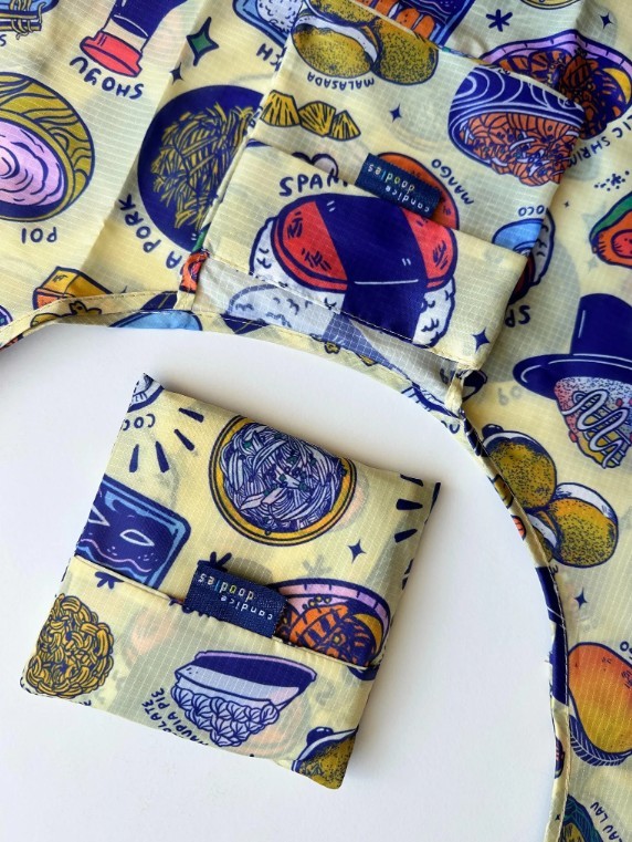 Nylon ripstop foldable eco-tote bags with all-over printed design featuring local Hawaiʻi foods, vegetables, and fruits!